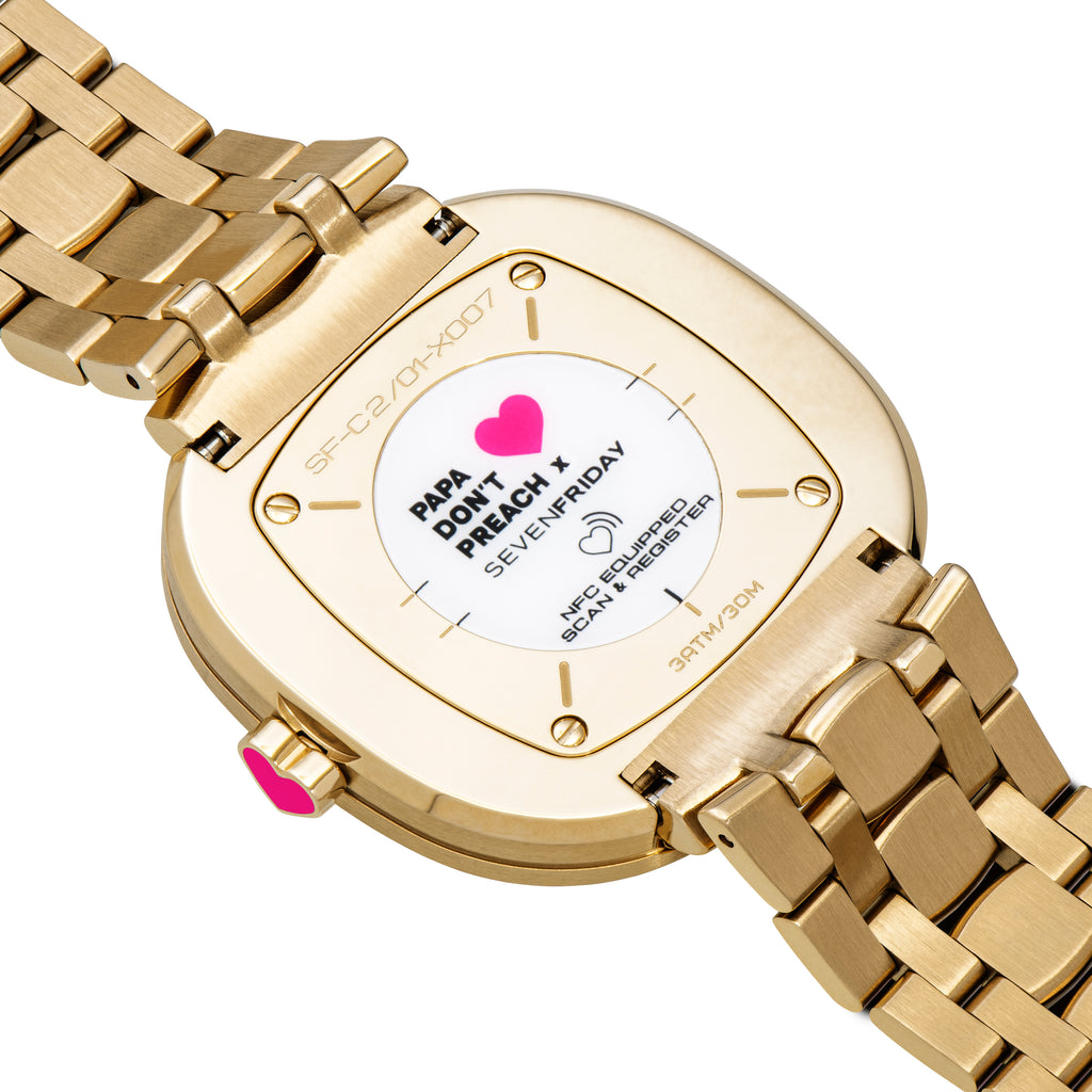 The watches are a part of the newly introduced C-series; C1/01 and C2/01. The C-Series are the thinnest and smallest watches SEVENFRIDAY has produced thus far, meaning that, unlike their other models, this one has a quartz movement. With this series SEVENFRIDAY has also broken tradition by subtly altering the shape of the case to a softer and more rounded ‘squircle.’ The C1/01 and C2/01 have a lacquered crown in the shape of a heart, a PAPA DON’T PREACH design signature, and the collaboration branding on the dial ring as well as around the side of the case. Available in a golden and silver color, both models come with a metal bracelet.