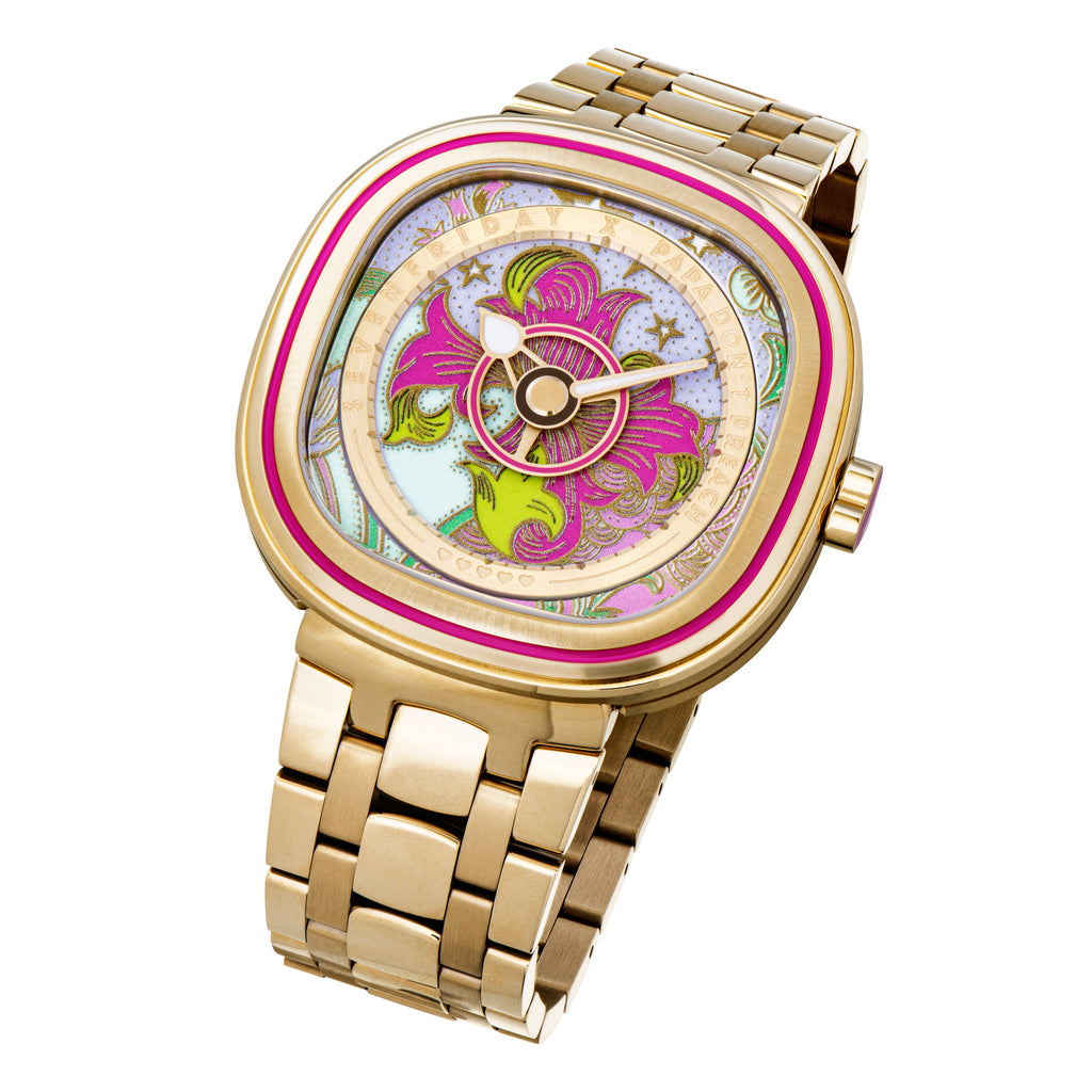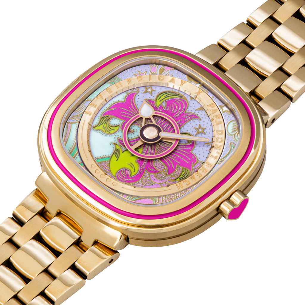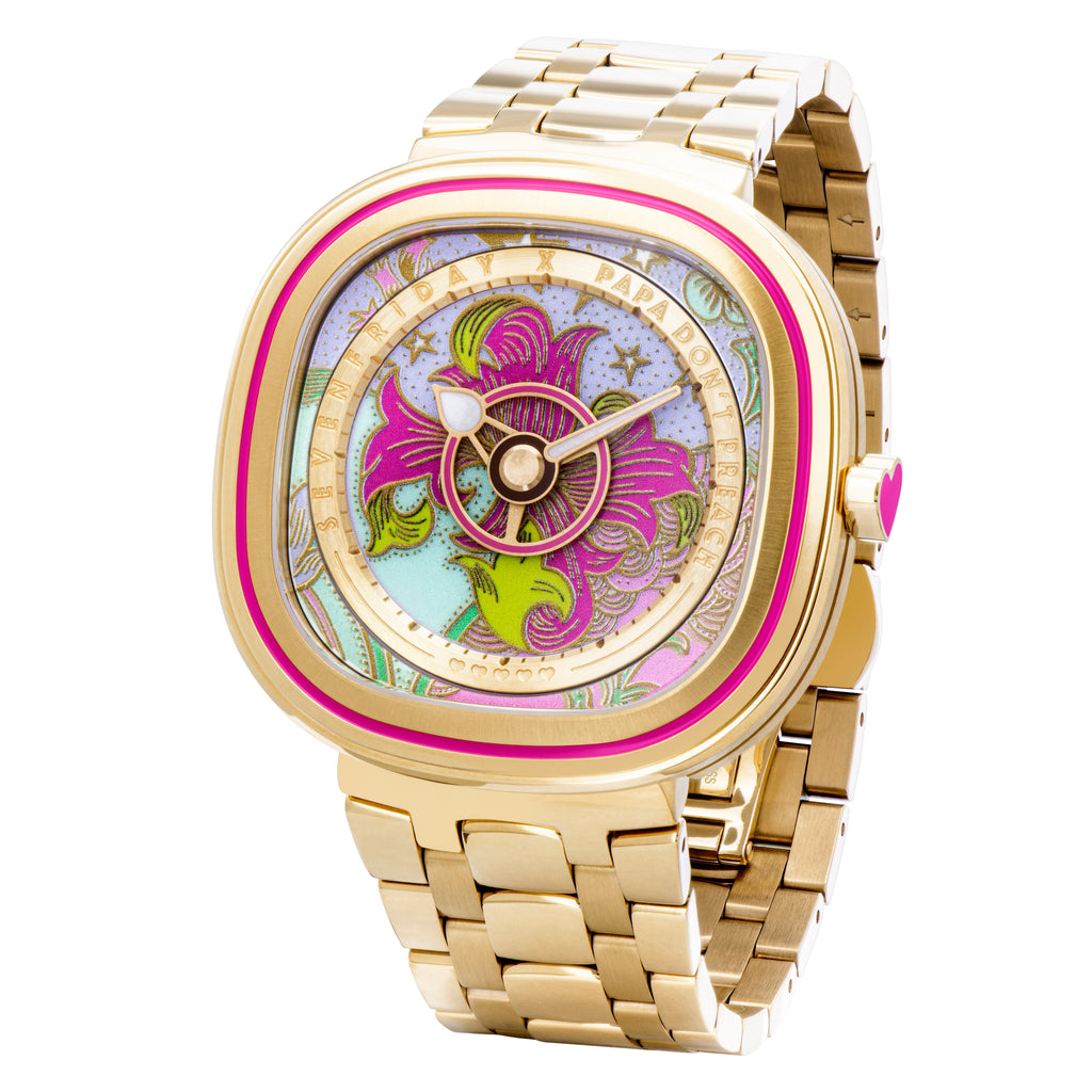 Dial: Three layers construction External dial ring and central dial in multi-layered color printings, gilded decor in relief printing, displaying an Indian flower decor, exclusively designed by PDP for SEVENFRIDAY Applied dial ring, in galvanic gold, engraved SEVENFRIDAY X PAPA DON’T PREACH highlighting the official collaboration